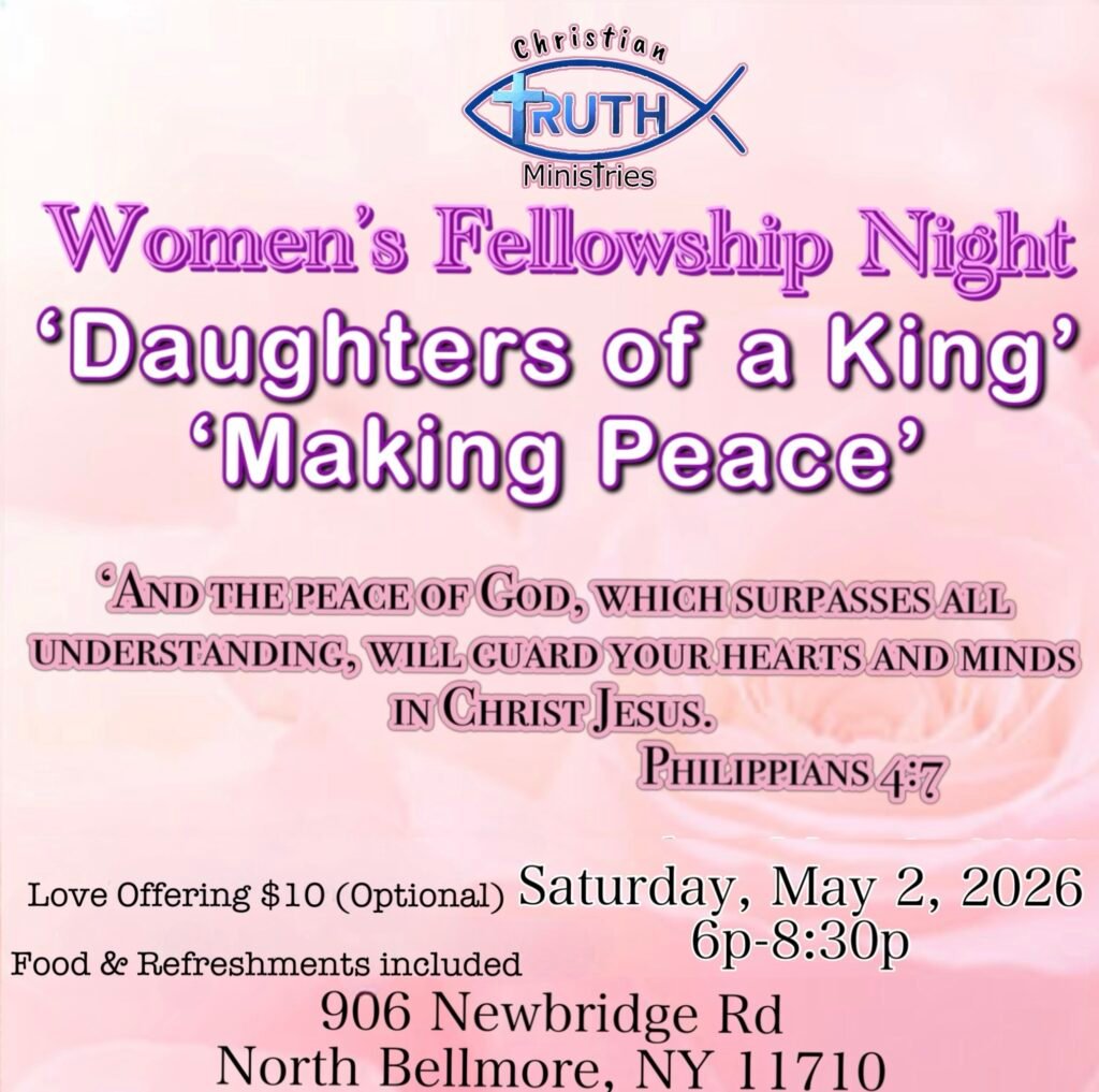A Women’s Fellowship Night, Daughters of a King, Making Peace. Come join us for a night you won’t forget. A night of fellowship, worship and healing.